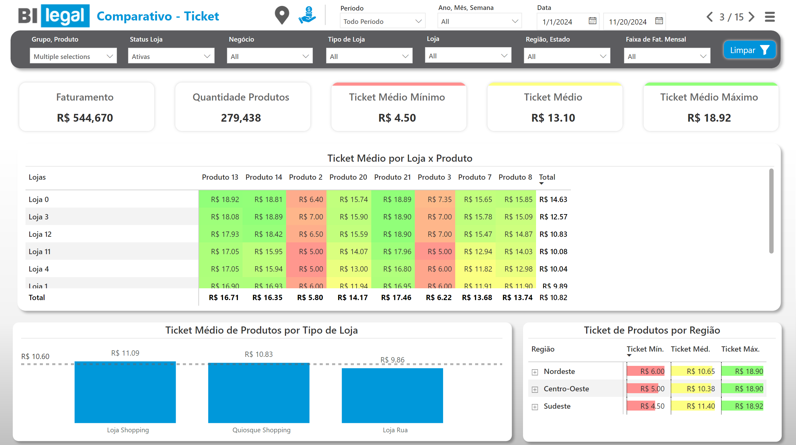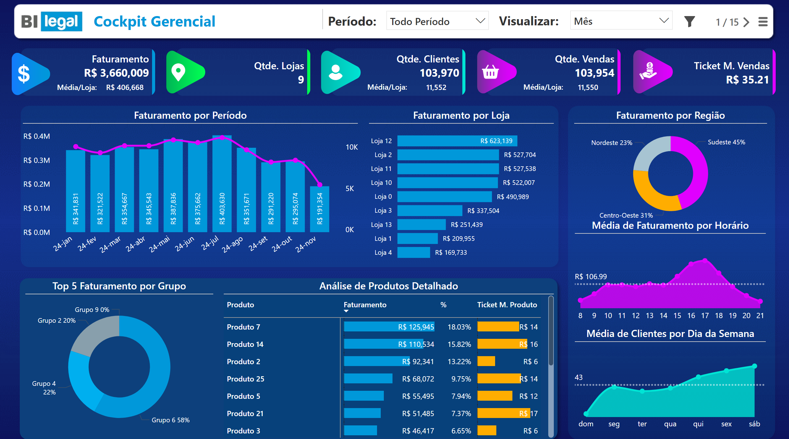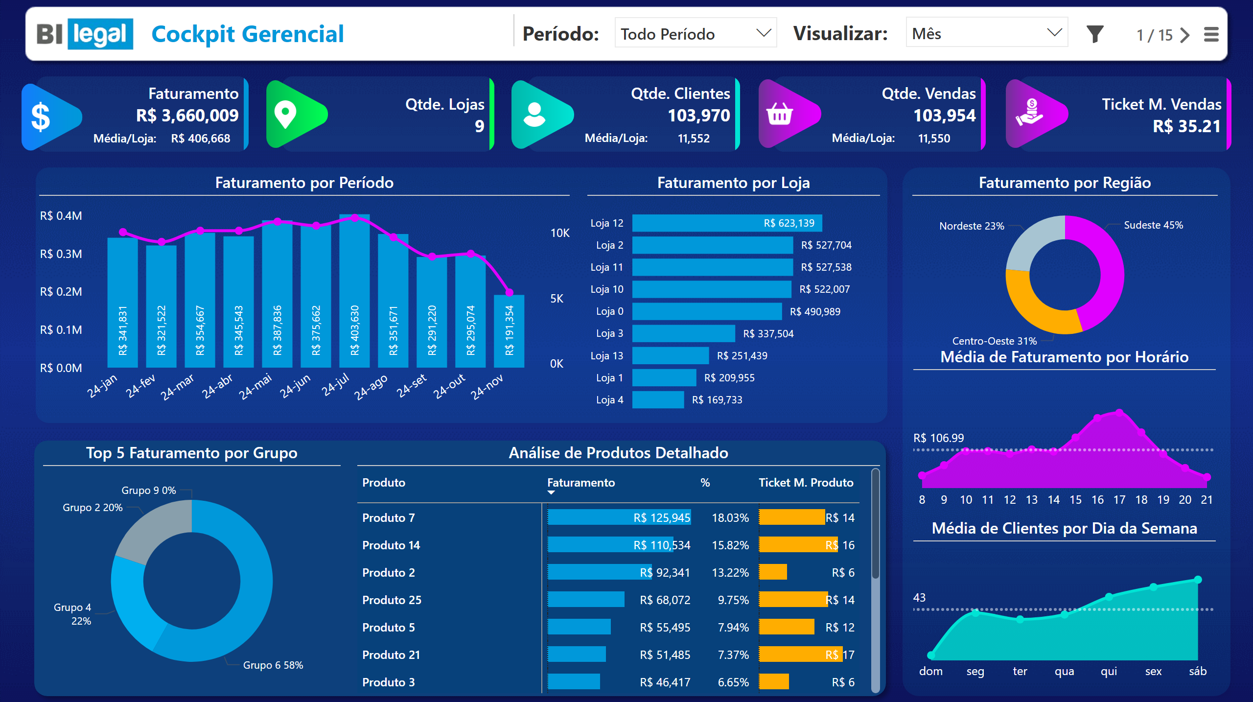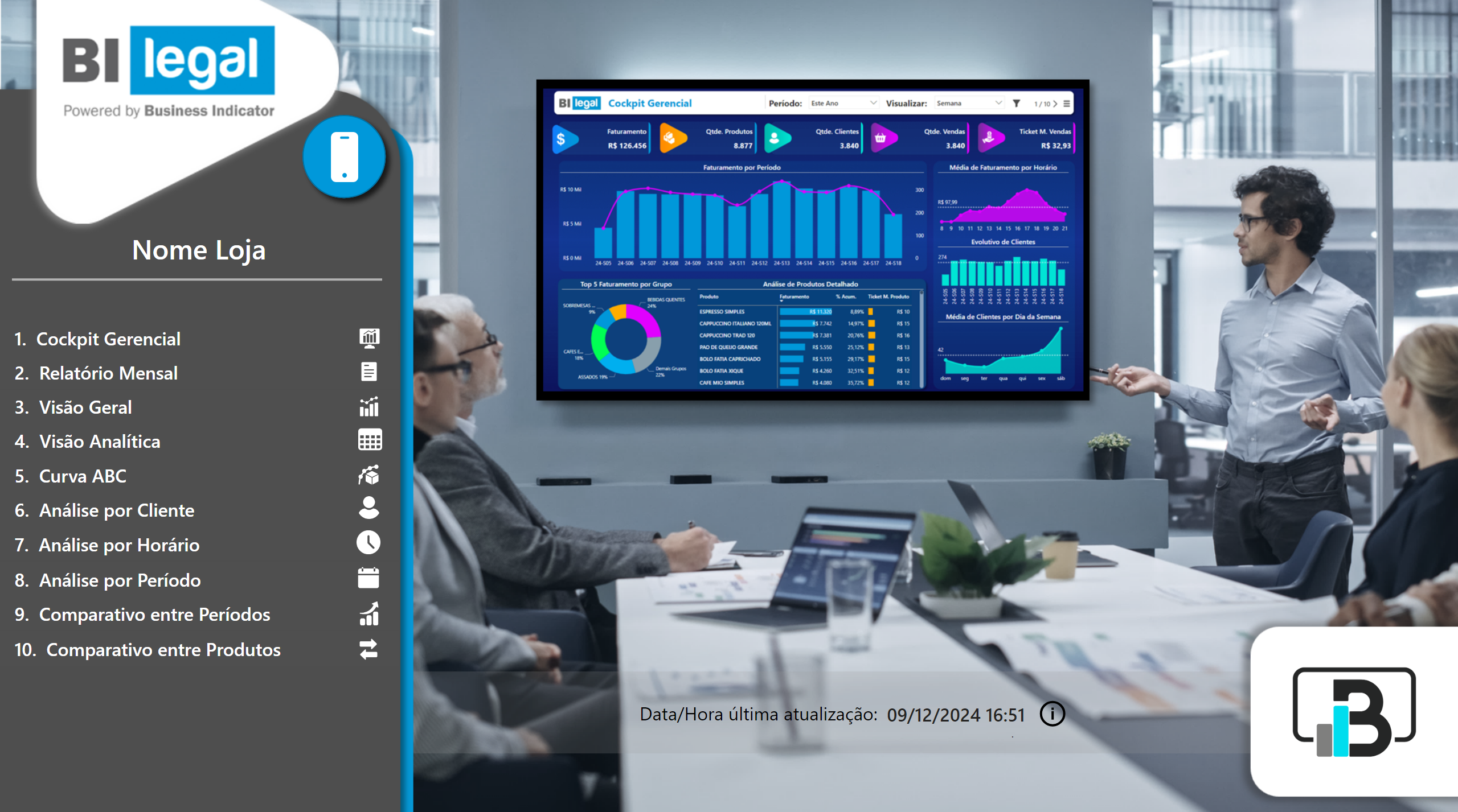 Aplicativo de Business Intelligence com dashboards e indicadores de performance integrados ao BI Legal, sob medida para food service e varejo.